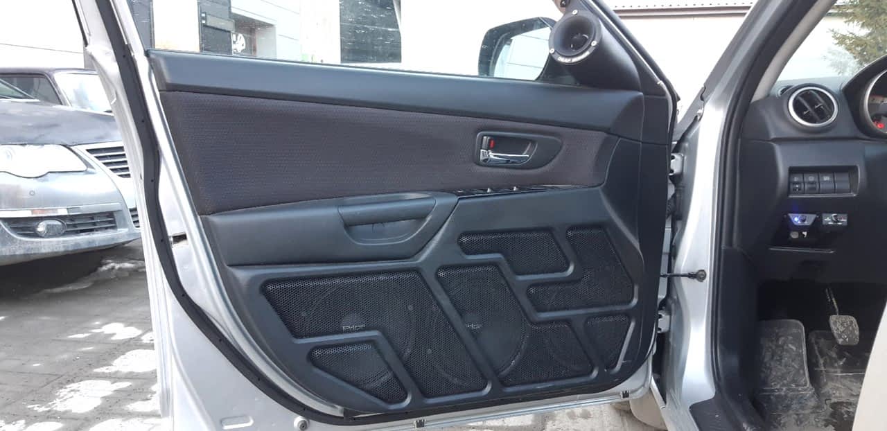 Подиум для установки колонок на дверь имеет индивидуальную конструкцию в зависимости от диаметра динамиков и материала обшивки. При установке не потребуется вырезать фрагменты в металле или демонтировать Pin-Up